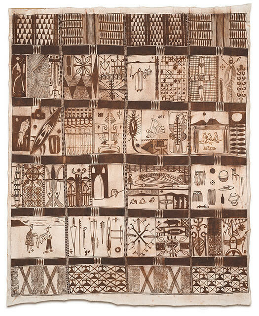‘Another unexpected treasure is the audio for the painting On another man’s land by John Pule. Pule was born in Niue and moved to Auckland as a child. He’s a painter, author and poet and he explores themes of migration and cultural identity in his work. We requested an interview with him about the painting. It turns out he wasn’t keen to be interviewed, but he pointed us to a passage in his essay ‘Clouds and Water’ where he writes about trying on a suit made in New Zealand, given to him by his father, and the significance of that moment, how the suit symbolised his new identity as a New Zealander and the tension it created with his identity as a Niuean. It’s a wonderful passage, and we have recorded it with a young Samoan actor as the audio for On another man’s land.