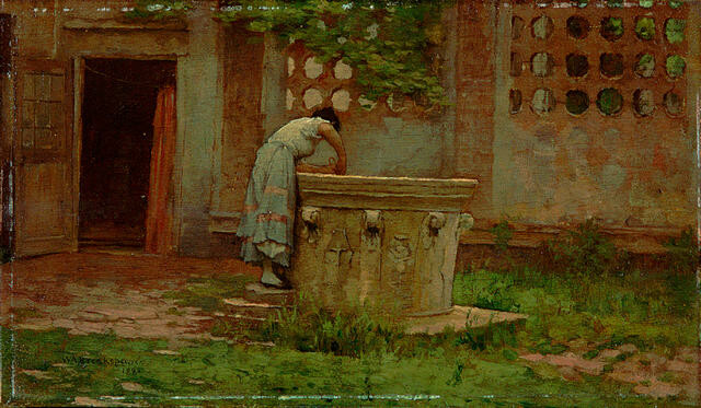 Tags: academicism, buildings (structures), circles (plane figures), doors, green (color), people (agents), wells (structures), women (female humans)