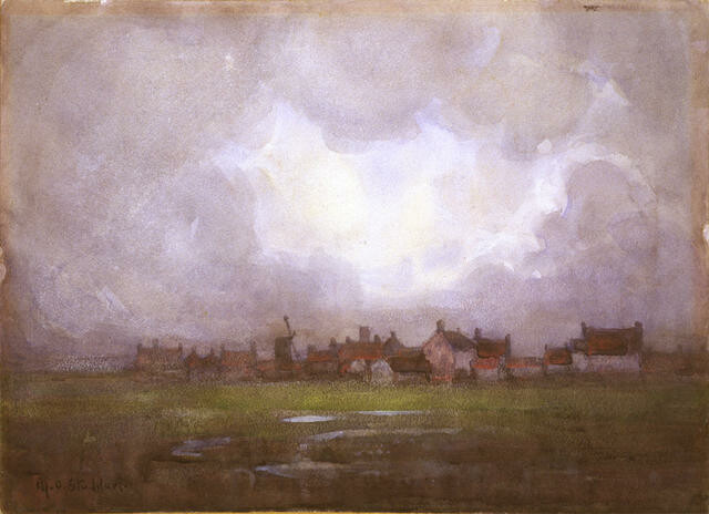 ‘Storm clouds, Blythburgh, Suffolk’ is typical of Margaret Stoddart’s growing interest in impressionism and painting outdoors while based in England between 1898 and 1906. The atmospheric conditions of the impending storm above Blythburgh have been rendered directly using wet washes of colour. Stoddart travelled widely, taking sketching trips to France, Italy and throughout Britain, often seeking out picturesque villages such as Blythburgh as her subjects. Stoddart enjoyed living at St Ives, Cornwall. The town’s reputation as a plein-air (open air) artists’ colony made it a magnet for New Zealand artists including Frances Hodgkins and Dorothy Richmond, who visited Stoddart there in 1902. (Brought to Light, November 2009)