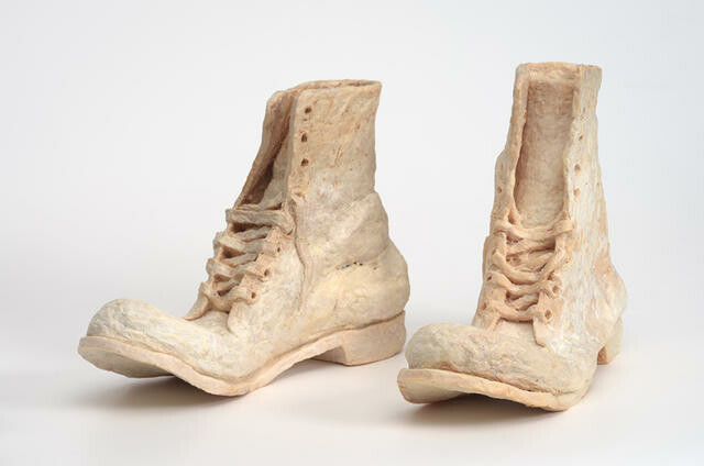 When first made, these boots were pure white. Grant Lingard was referencing the neo-Nazis that stomped around Ōtautahi Christchurch in their white-supremacist uniform of shaved heads and Doc Marten boots. As with the Sunlight soap rugby boots across the room, his choice of material was pointed. Knight’s Castile is a delicate white soap, a brand known at the time for its tender ‘mother and baby’ advertisements – a world away from the tough image the average skinhead wanted to project.