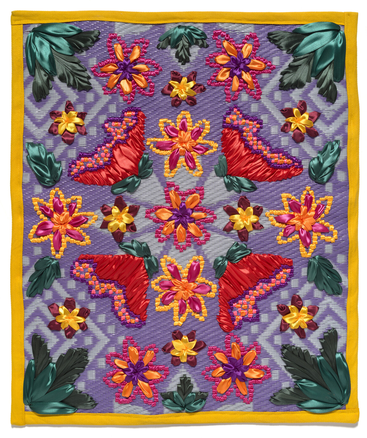 Serene Hodgman Va'al Lau Fuala'au / See My Pretty flower 2022. Silk ribbons on segment of woven plastic mat. Courtsey of the artist and Masterworks Gallery