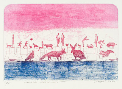 Alongside these serene views of the countryside are several examples by Barry Cleavin and Bing Dawe that comment on the abattoir as the inevitable fate for livestock and provide a striking contrast to the tranquil landscapes.