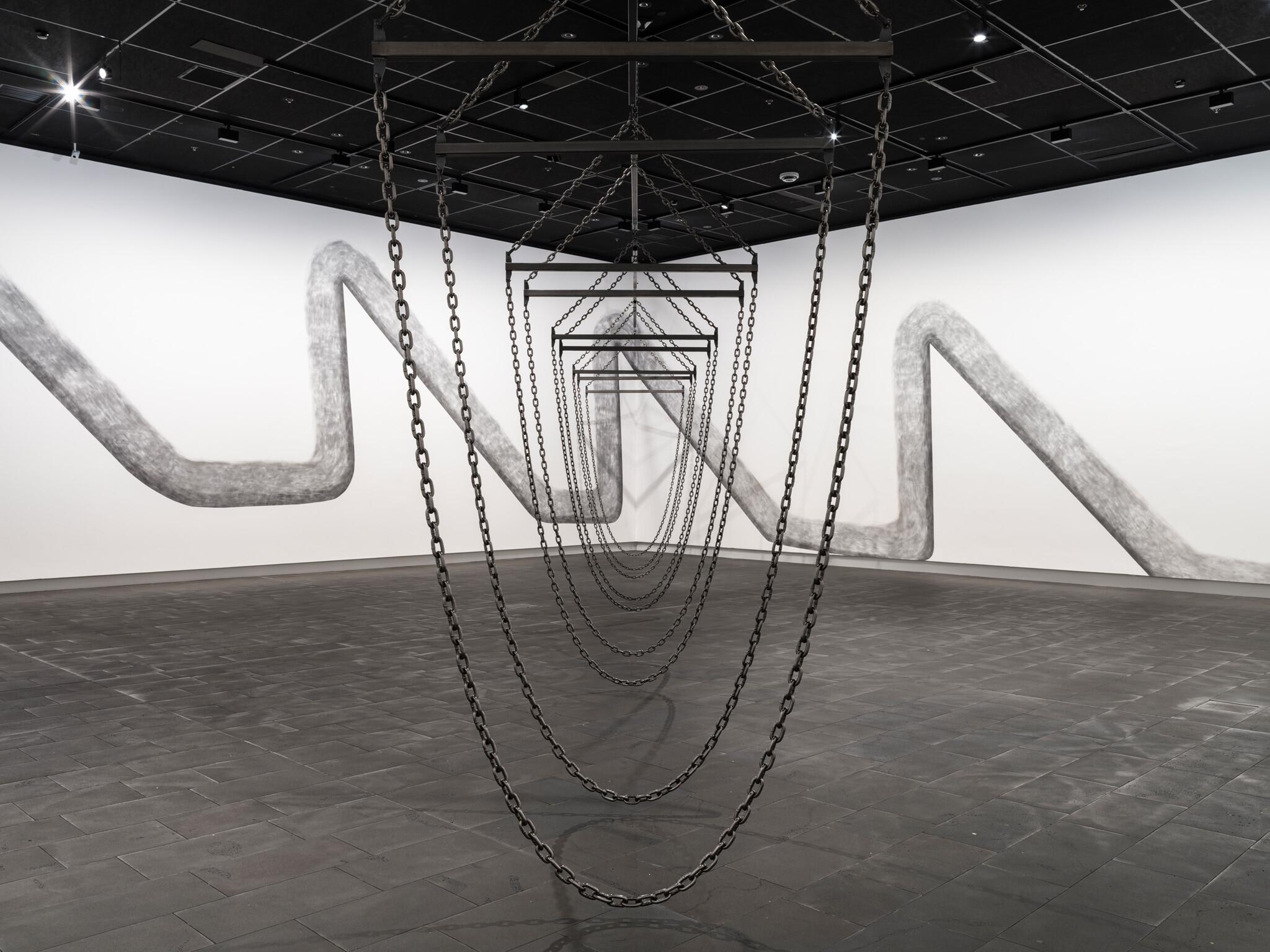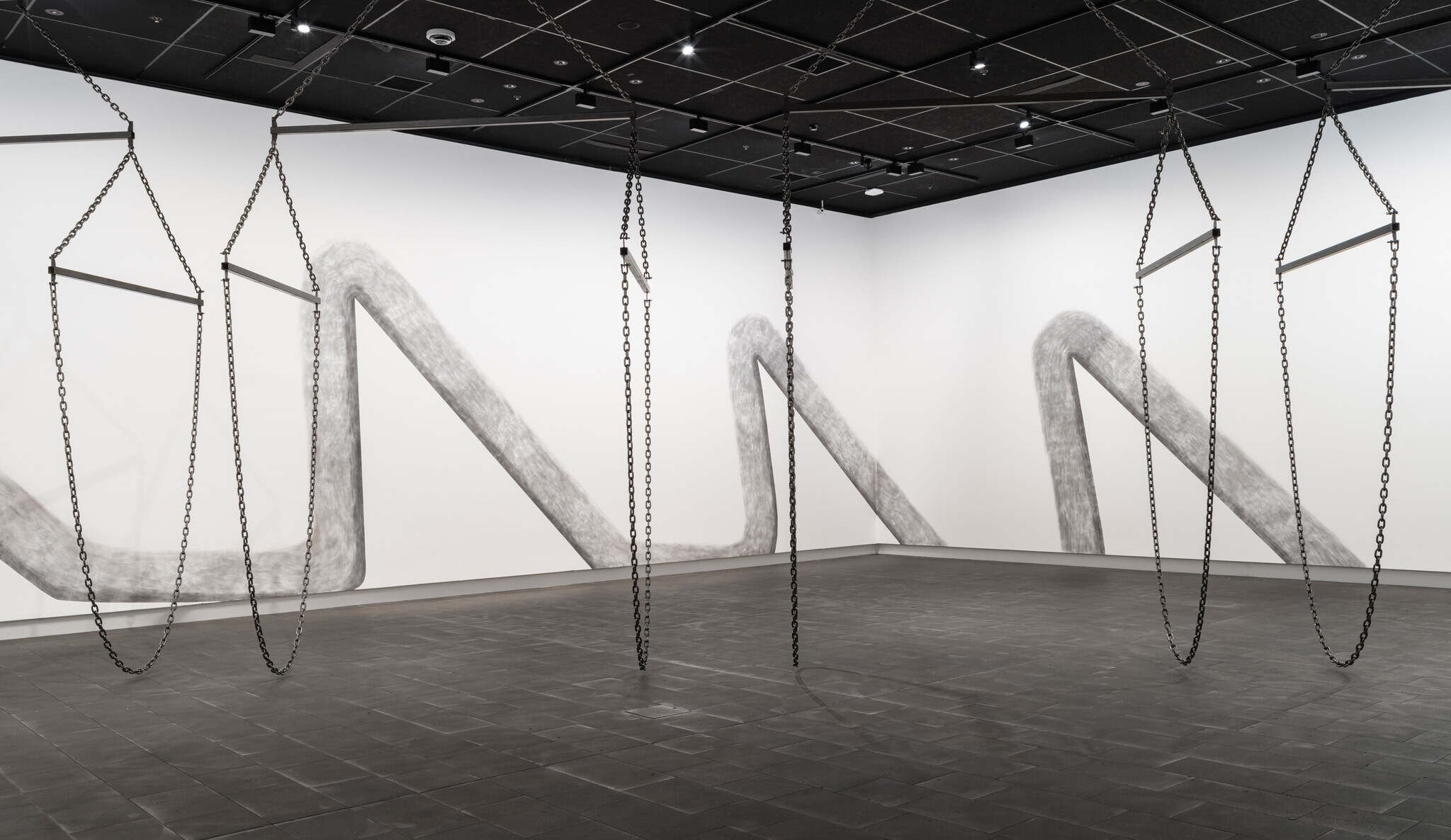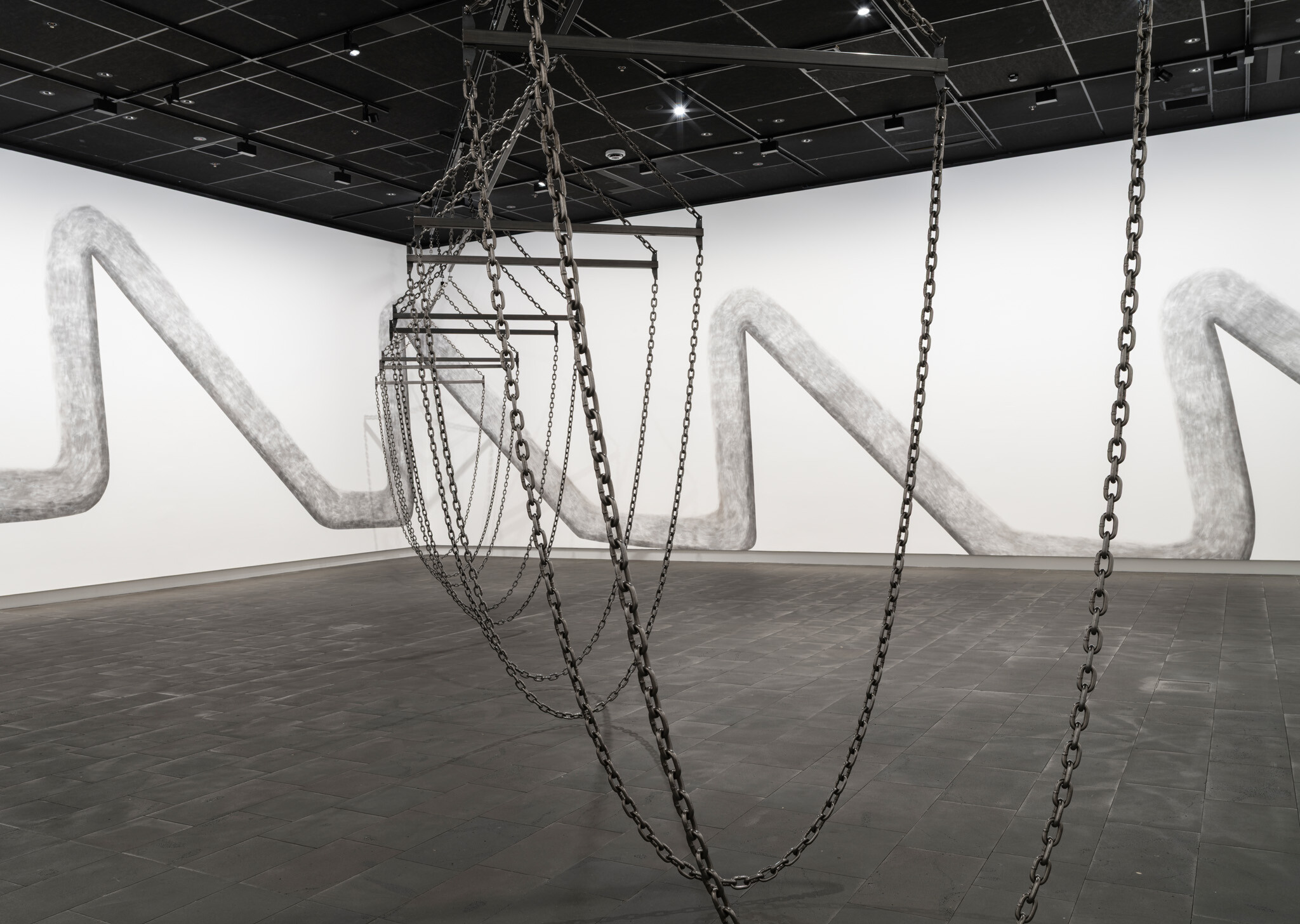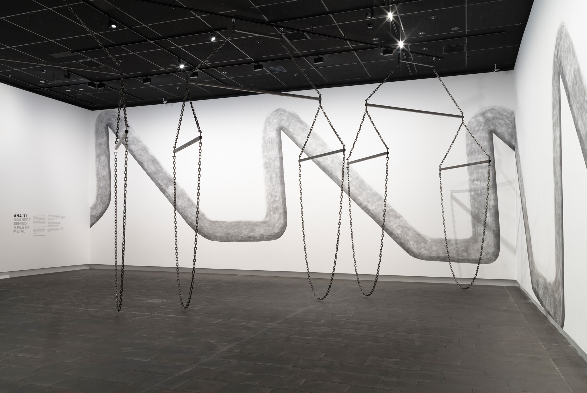 In this new commission, Ana Iti (Te Rarawa, Ngāi Tūpoto, Ngāti Here) references kauri logging, an industry that flourished in Te Tai Tokerau during the nineteenth century. Drawn using charcoal from burnt kauri timber, large saw teeth cut into the substructure of the gallery. Chain and metal pipes hint at the form of a marine crane, or how logs are bound for transport in waterways. The relationship of rākau to wai, or tree to water, reflects the kinship of kauri to tohorā, the Southern right whale. Both now face the threat of extinction, a sign of broader ecological devastation.