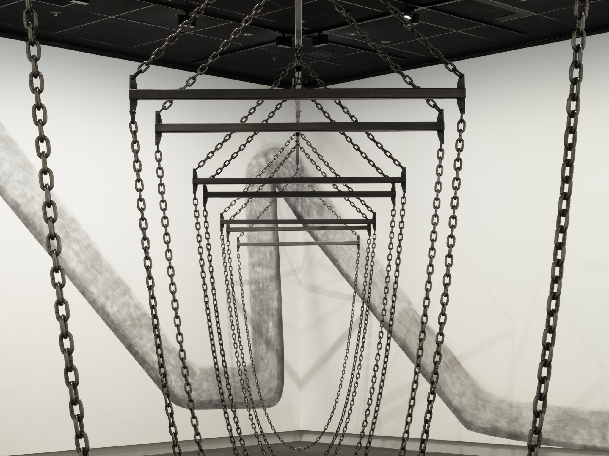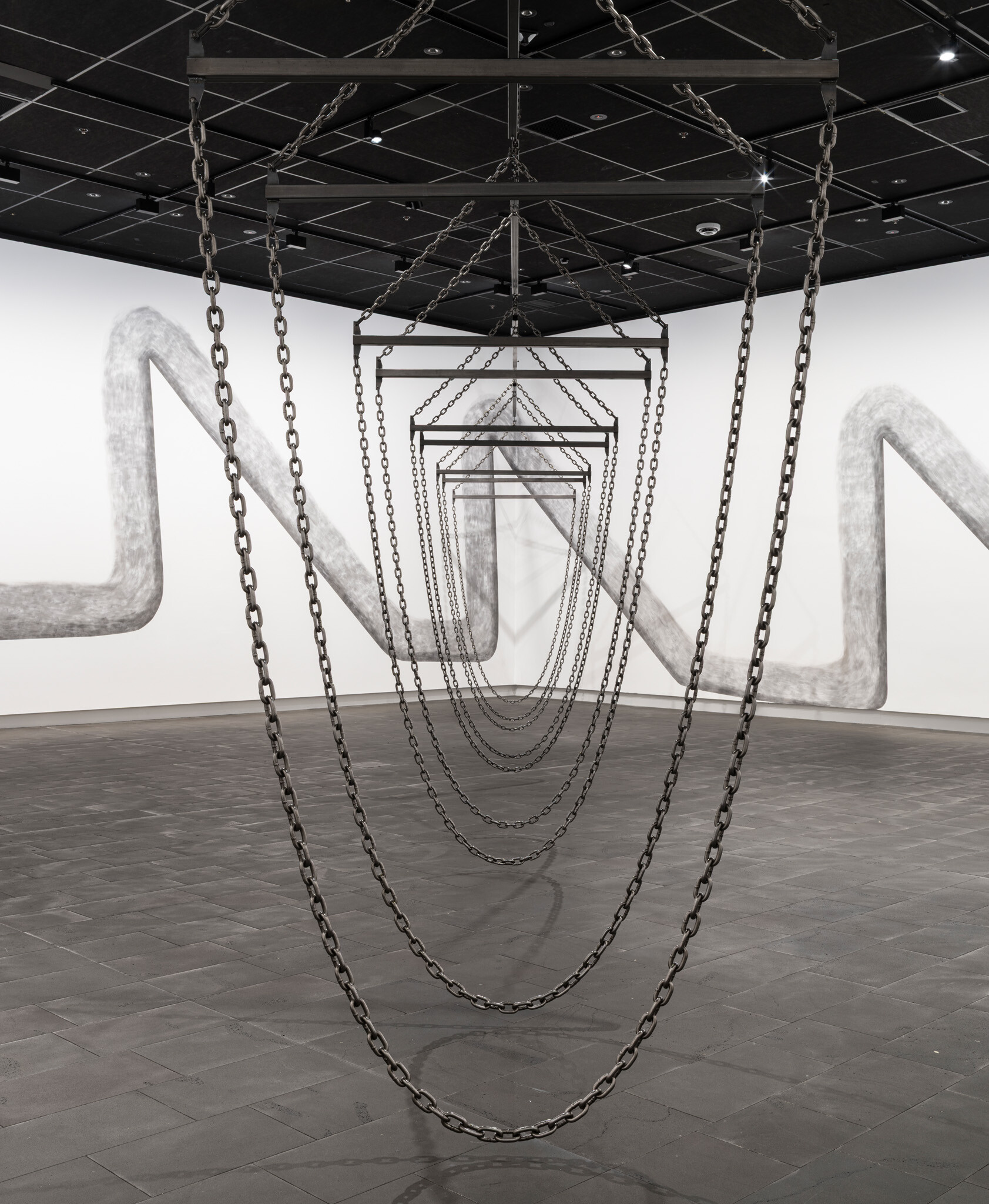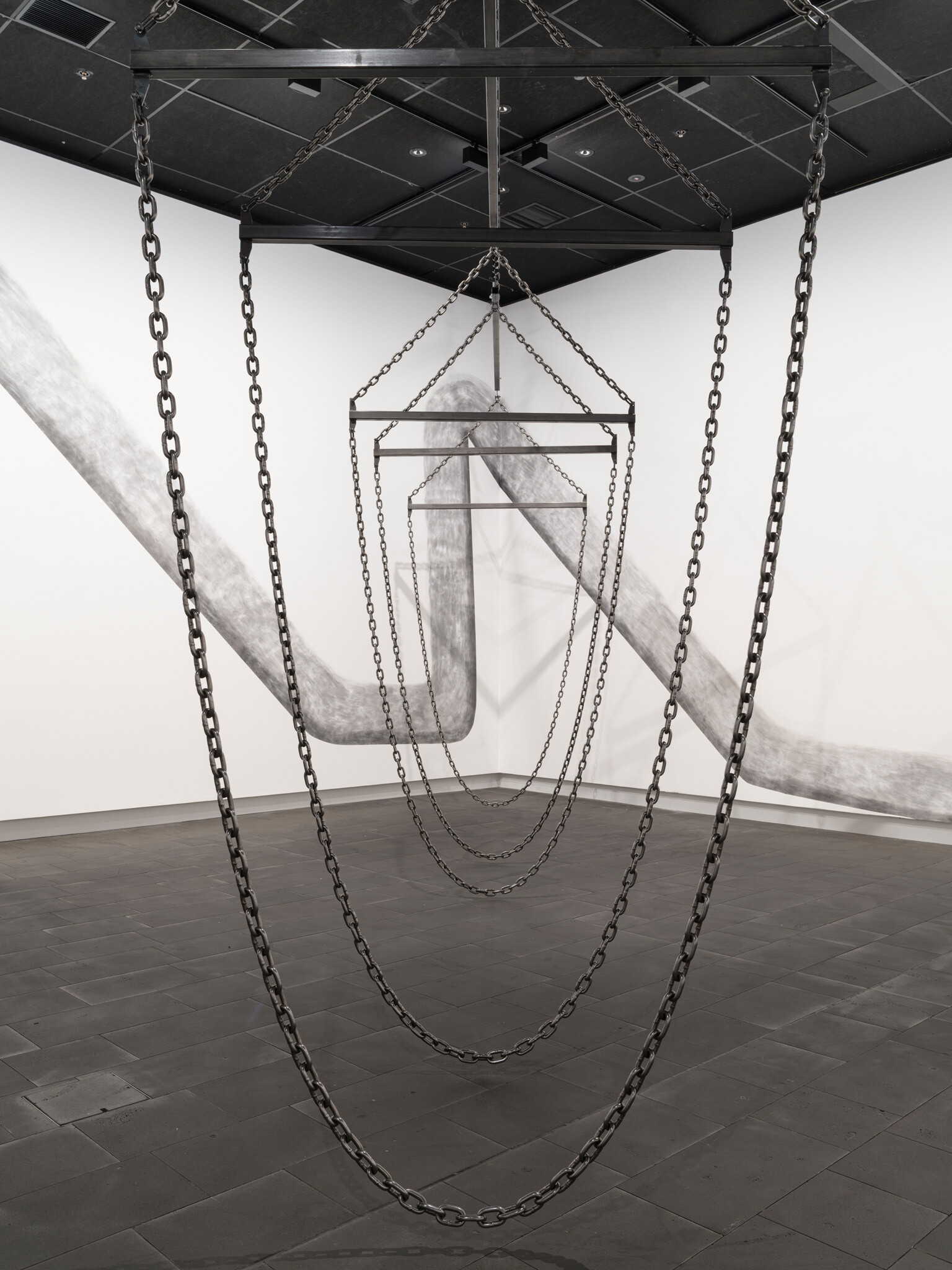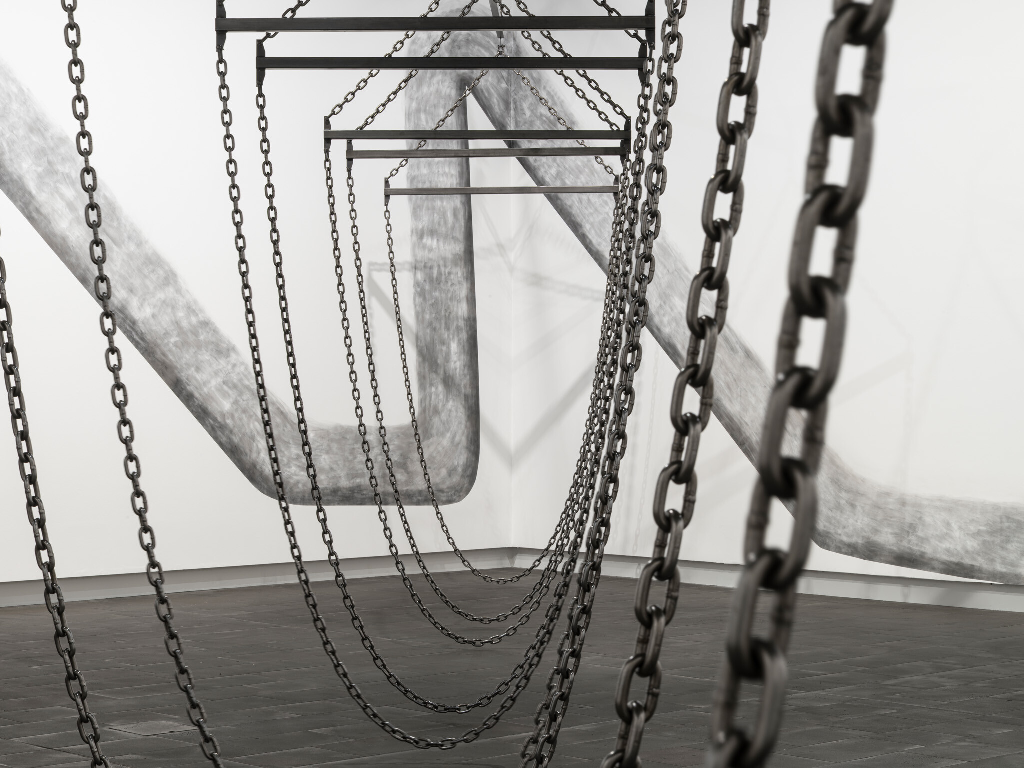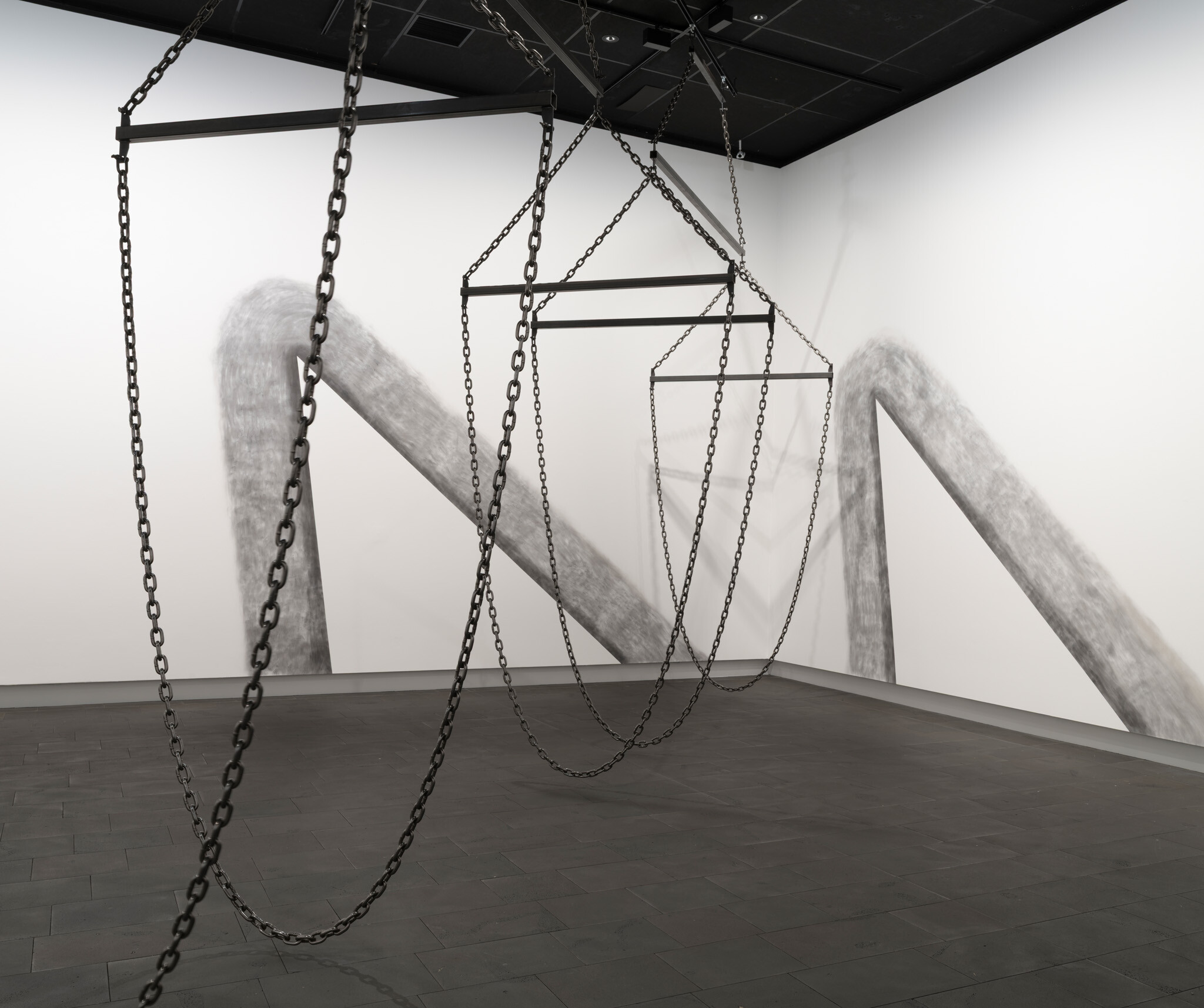 In this new commission, Ana Iti (Te Rarawa, Ngāi Tūpoto, Ngāti Here) references kauri logging, an industry that flourished in Te Tai Tokerau during the nineteenth century. Drawn using charcoal from burnt kauri timber, large saw teeth cut into the substructure of the gallery. Chain and metal pipes hint at the form of a marine crane, or how logs are bound for transport in waterways. The relationship of rākau to wai, or tree to water, reflects the kinship of kauri to tohorā, the Southern right whale. Both now face the threat of extinction, a sign of broader ecological devastation.