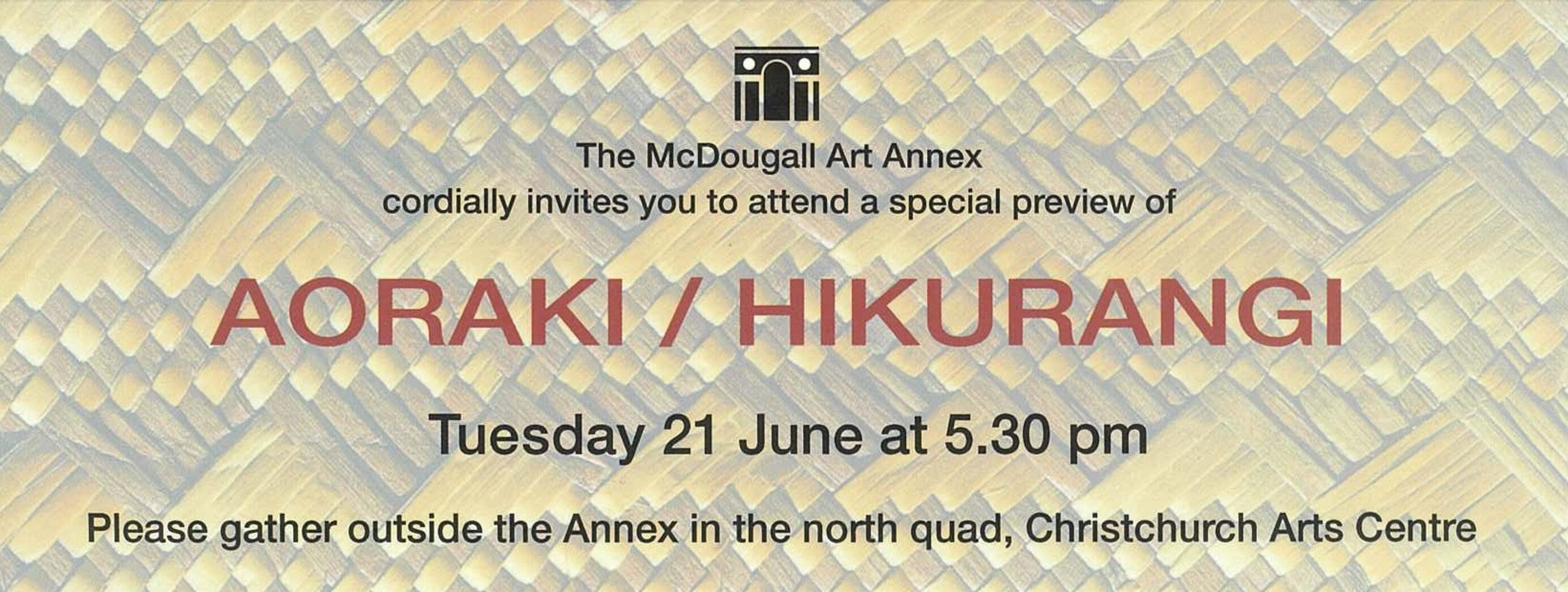 The kaupapa (purpose) of this exhibition is to acknowledge and symbolise, through the work of contemporary artists, the historic meeting during the centenary of Ngata's people, the Ngati Porou from the North Island's East Coast, and the Ngai Tahu of the South Island. The exhibition's title Aoraki/Hikurangi refers to the geographical location and the whakapapa of each iwi. Hikurangi is a mountain sacred to the Ngati Porou, who believe that Hikurangi was the first part of Maui's great fish to reach the surface. Maui's canoe and broken bailer can still be seen on the mountain's side.