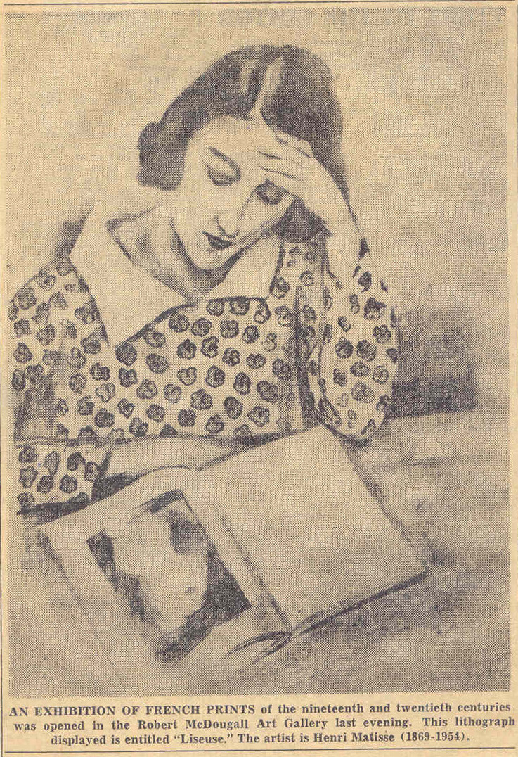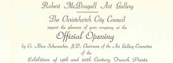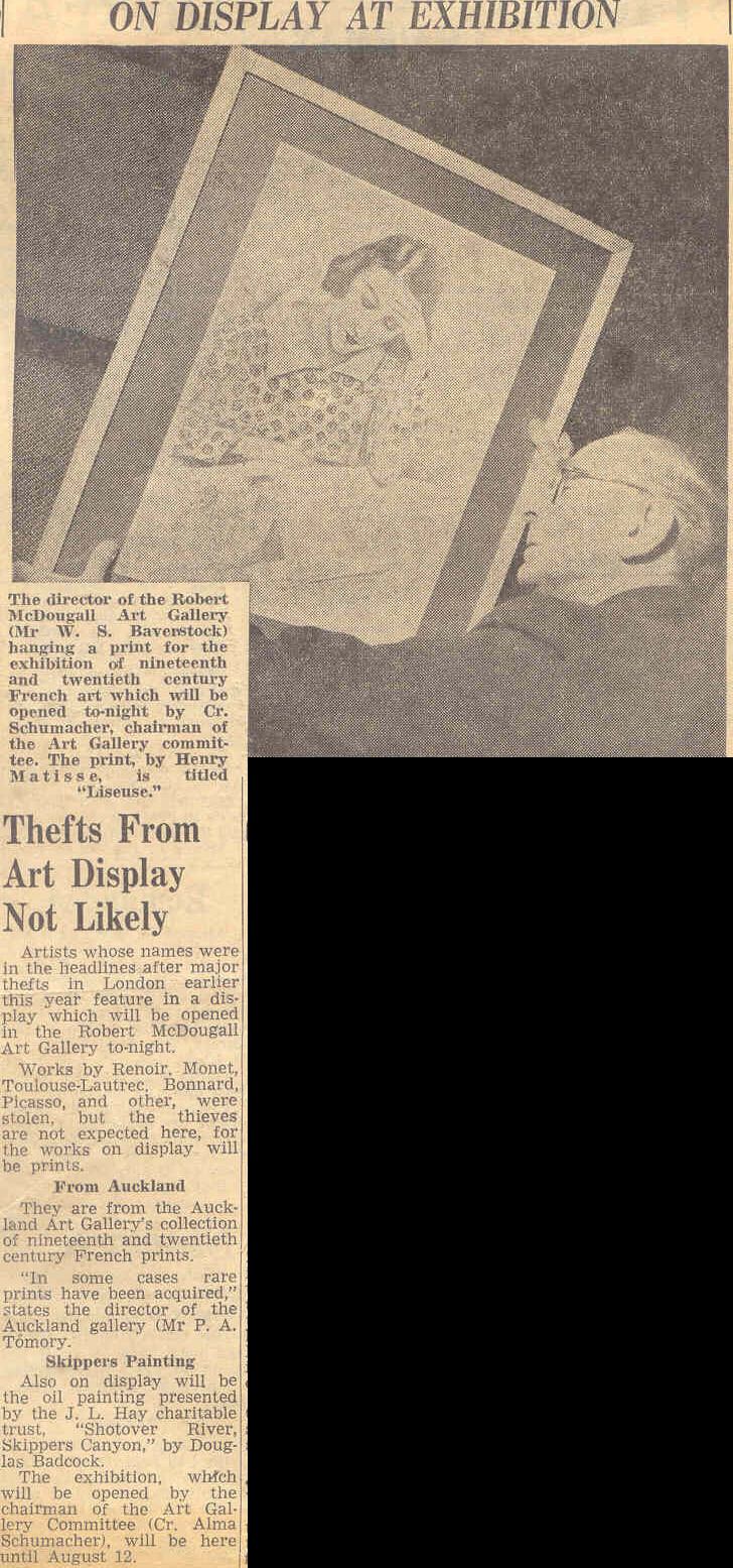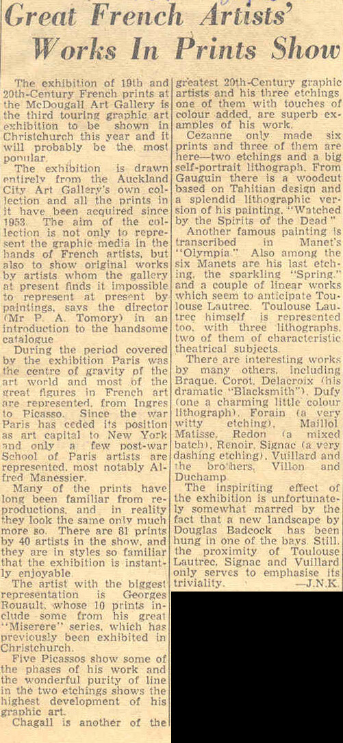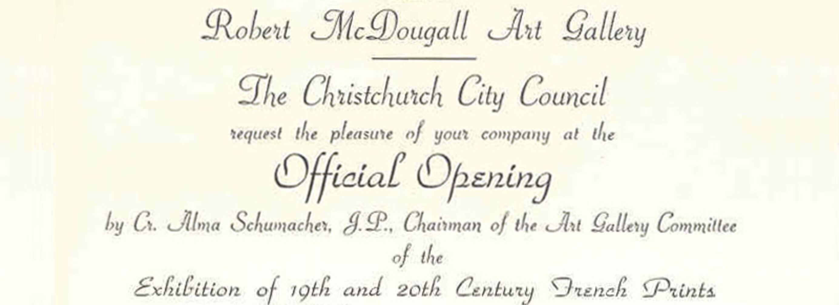 This exhibition of 19th and 20th century French prints was the ninth touring exhibition held at the Robert McDougall Art Gallery during the previous twelve months. It was from the collection of the Auckland Art Gallery (acquired since 1953) and was lent for a tour of six galleries.