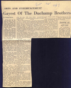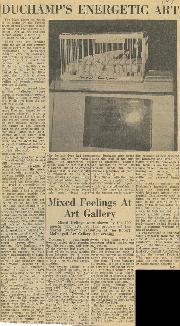 This exhibition of works by Marcel Duchamp (1887-1968) proved something of a sensation in Christchurch in 1967. It was drawn from the Mary Sisler Collection and included works now almost too familiar: Roue de Bicyclette, LHOOQ and Fontaine. This last work, a urinal, and Priere de toucher, a fur-trimmed breast, proved too much for local tastes. Councillor P. J. Skellerup dubbed them "crude exhibitionism", Gallery director William Baverstock dismissed them as "just a piece of French daring", though he admired Duchamp's painting and certainly supported the exhibition overall. Predictatbly there were counter-protests and letters to the editor. Click on the '<' and '>' buttons to follow the controversy.