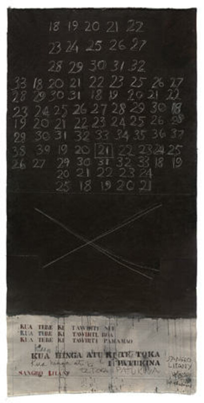 One of New Zealand's most respected artists, Ralph Hotere is represented by work which embraces universal, rather than specifically Māori, concerns. Although he does not view himself as a political painter, he frequently voices concerns about the human condition and the environment. Hotere has said, 'I am a Māori by birth and upbringing. As far as my work is concerned this is coincidental.' By contrast, the issues surrounding art and culture are central to the work of Peter Robinson. His 'percentage painting' contain references to Māori genealogy, and explore the way some artists can be seen as 'cashing in' on the current demand for fashionable and bankable Māori art. Robinson works within established European artistic traditions whilst also exploring both contemporary Māori issues and those personal to him.