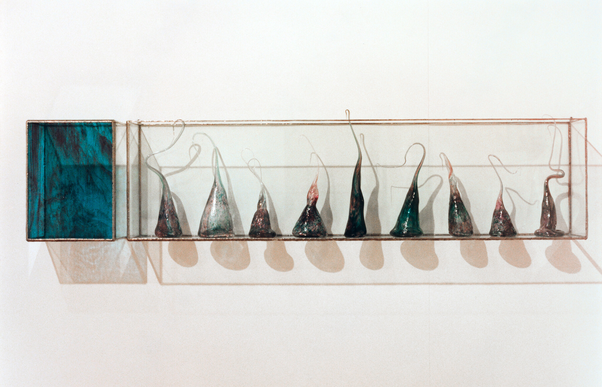 Denise Kum explores a fascination with the properties of the substances, exploiting their differing chemical make-ups. Her liquiferous blue glass objects sit on a table of experiments, making a connection between the laboratory and the studio, and exposing both areas as sites of sensory and scopic practices.