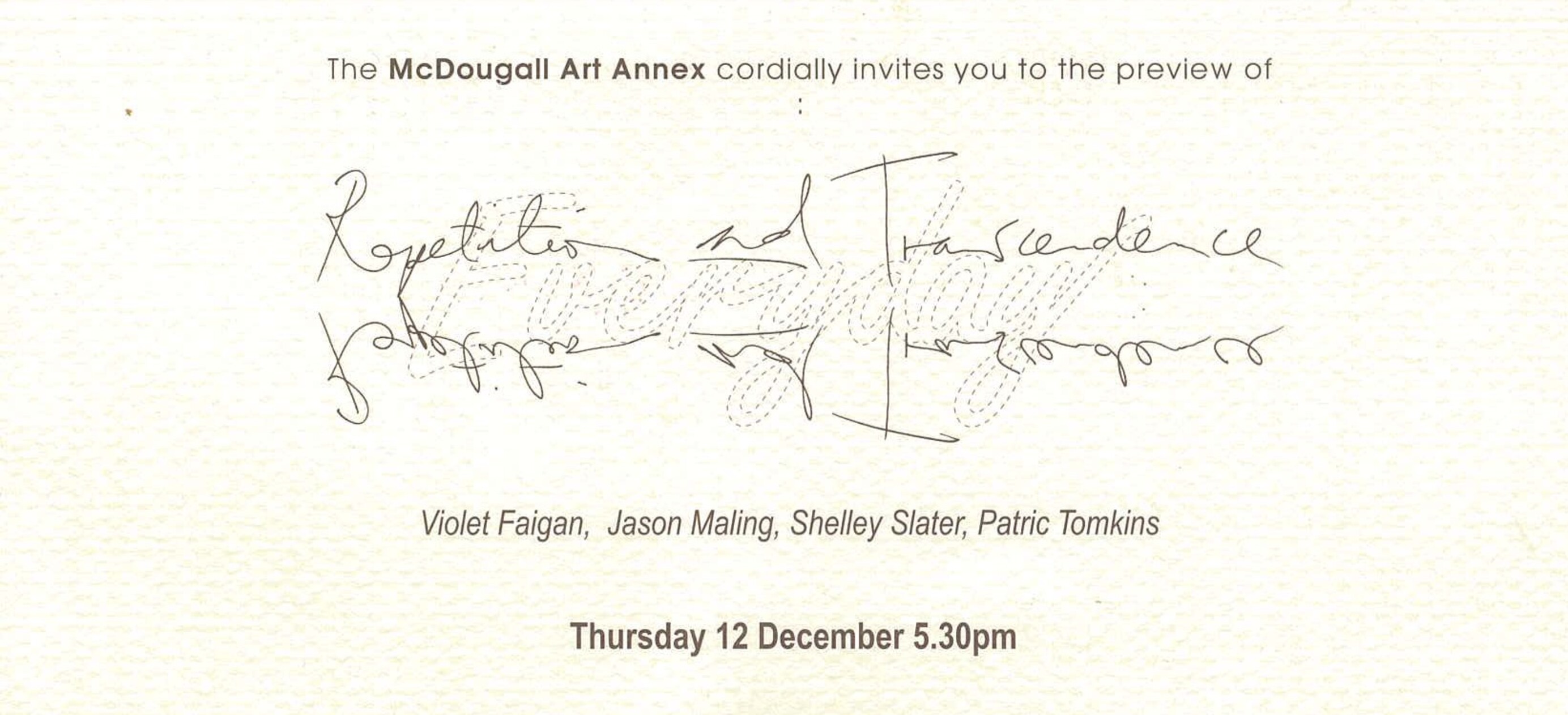 Avoiding any preconceived creative intention, each artist has set a process in motion and then awaited the results. Often the 'experiment' involves strict rules and challenges, and all have evolved over an extended period of time. Slater has painstakingly carved a pot from Oamaru stone; Tomkins has built up large areas tirelessly worked in graphite pencil, which can be read as landscapes, abstracts or building site close-ups, using the most proletarian unit of construction: the brick. The laborious nature of the works in Everyday: Repetition and Transcendence is fundamental to these artists. Wary that some contemporary art seems too easy and effortless, their works involve an acknowledgement of the time-consuming and repetitive tasks that often form part of the creative process. The artists believe that disciplined, repetitive processes can result in contemplative states that release the consciousness, allow a closer examination of self and create the opportunity to make 'honest marks' free from hyperbole and contrivance.