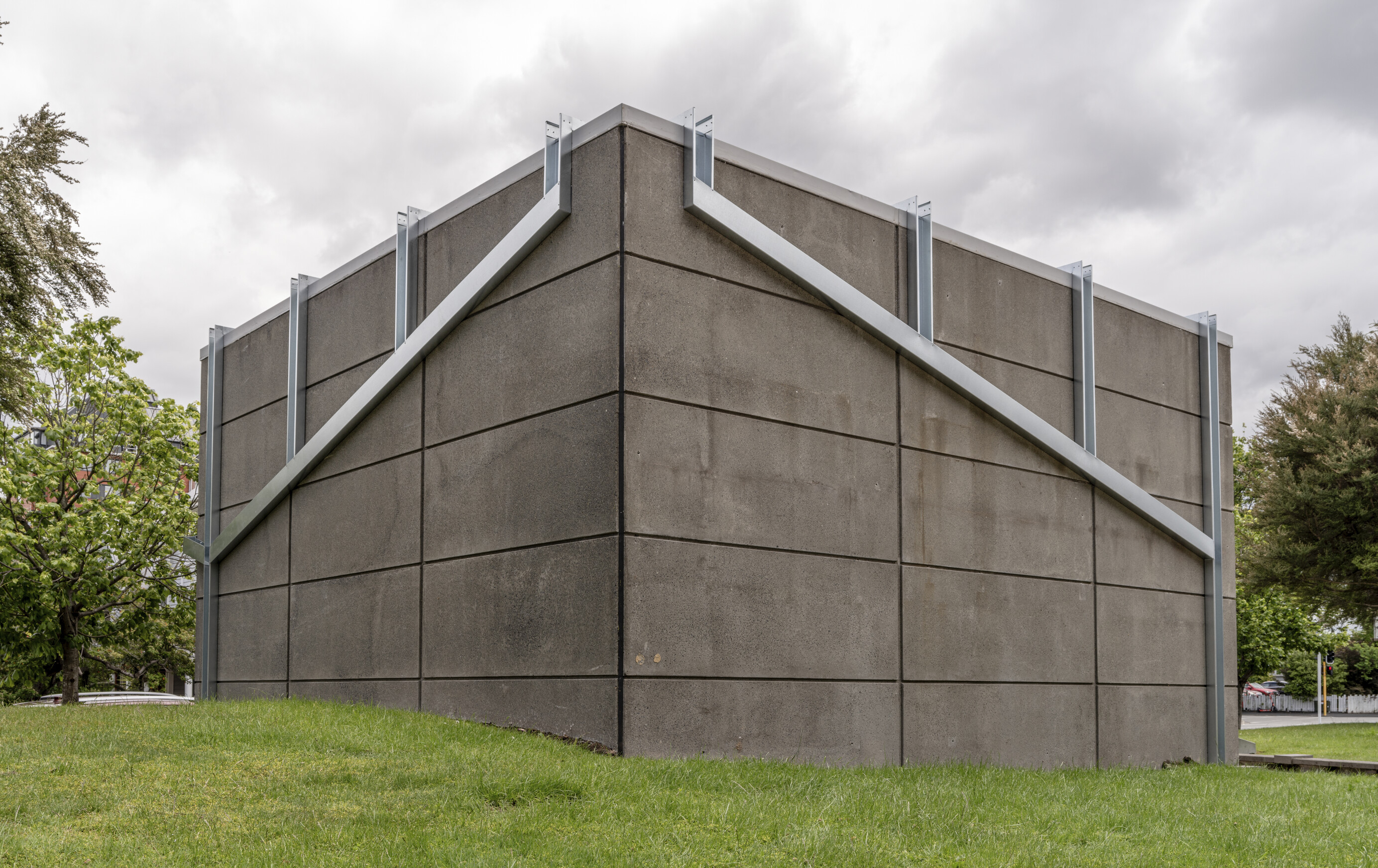 Wendelien works in a site-specific way, responding to the environment and structures around her. Here she allows us to see the steel and concrete, revealing building systems and infrastructures that are often hidden in plain sight. Visually, it recalls the neo-brutalist architectural style that Christchurch is known for. In wet weather, this grid of steel guttering will collect rainfall and channel it towards the ground where it can drain away.