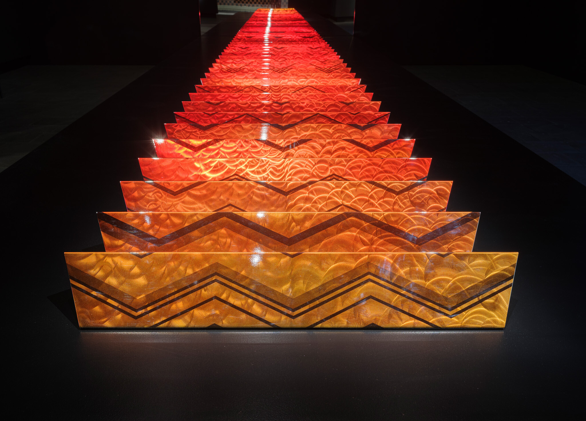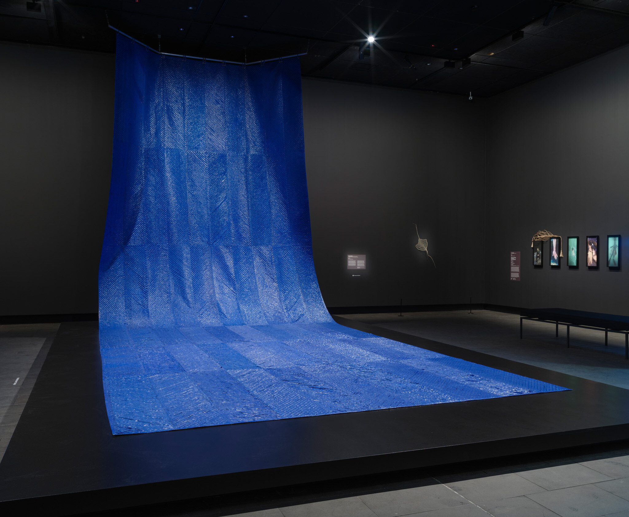 As we enter the Whāia te Taniwha exhibition, I gasp audibly, struck by a wave of nostalgia as I take in Mataaho Collective’s work, Kiko Moana. Like our rivers that flow from the mountains to the sea, the deep blue work cascades from its elevated position and rushes toward me in full glory. Ki uta ki tai. From the mountains, to the rivers, to the sea. It demands attention and respect.
