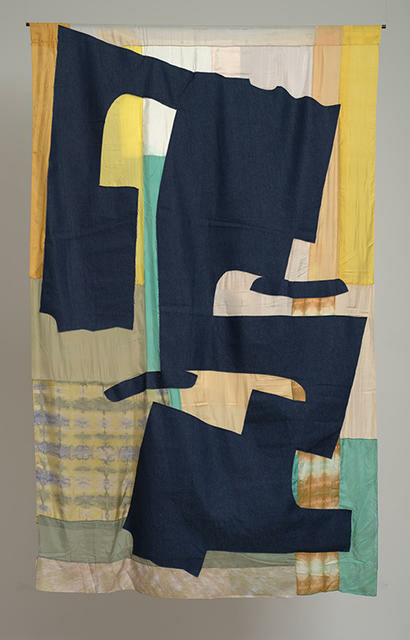 Emma Fitts has created an abstract portrait of sorts in her collaged fabric tribute to Marlow Moss. Marlow was a British modernist painter and sculptor who in around 1919 renamed herself (from Marjorie Moss), adopted standard masculine attire, and worked in a refined constructivist style until the 1950s. Made during her Olivia Spencer Bower Award project in Ōtautahi Christchurch in 2014, Emma combined an interest in overlooked histories with formalist concerns, using salvaged silk scarves and woven plaid cloth to construct a personal gallery of role models and protagonists.