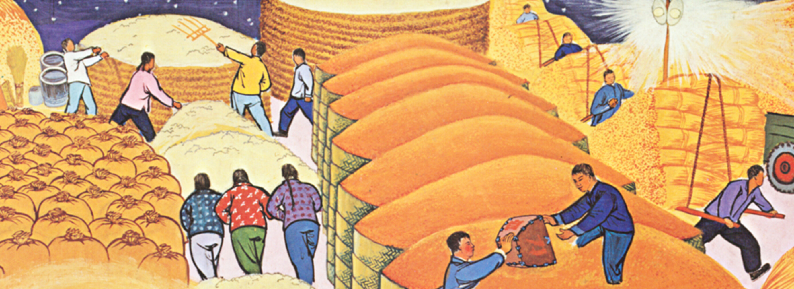 Huhsien County is situated in the central part of Shansi Province of China. Facing the Weiho River in the North and falling back on the ChinLing mountains in the South, it is a stretch of fertile land rich in produce, comprising 21 rural peoples communes, with a population of 430,000. The painting movement in Huhsien County, Shenshi Province, started from small beginnings. It started in fact on the construction site of a new reservoir in 1958, year of the great Leap Forward, when a few people had the idea of painting the work in progress as a record and stimulus, Conditions were difficult at first and where no paints were available they made their own colours from soot, red soil, and wine. But their initiative was taken up by the County Party Committee who organised art lasses in which the present painters could learn techniques from professionals.
